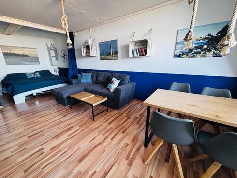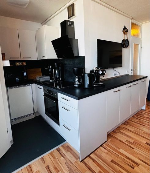 Auf rund 51 m² bietet die Wohnung ein Schlafzimmer mit Doppelbett, ein separates Kinderzimmer mit Hochbett, Spielecke und Schreibtisch sowie eine offene Wohnküche mit Esstisch. Dazu gehören ein Flachbild-TV, Radio und eine gut ausgestattete Küche mit Ceranfeld, Backofen, Kühlschrank, Kaffeemaschine, Wasserkocher, Handrührgerät, Toaster – und sogar ein Waffeleisen für gemütliche Nachmittage auf dem Balkon. In der Küche stehen außerdem alle Basics für den unkomplizierten Start bereit: Gewürze, Kaffee, Tee, Zucker, Salz, Spülmittel und Kaffeefilter – nehmt gern, was ihr braucht, und füllt auf, was fehlt.