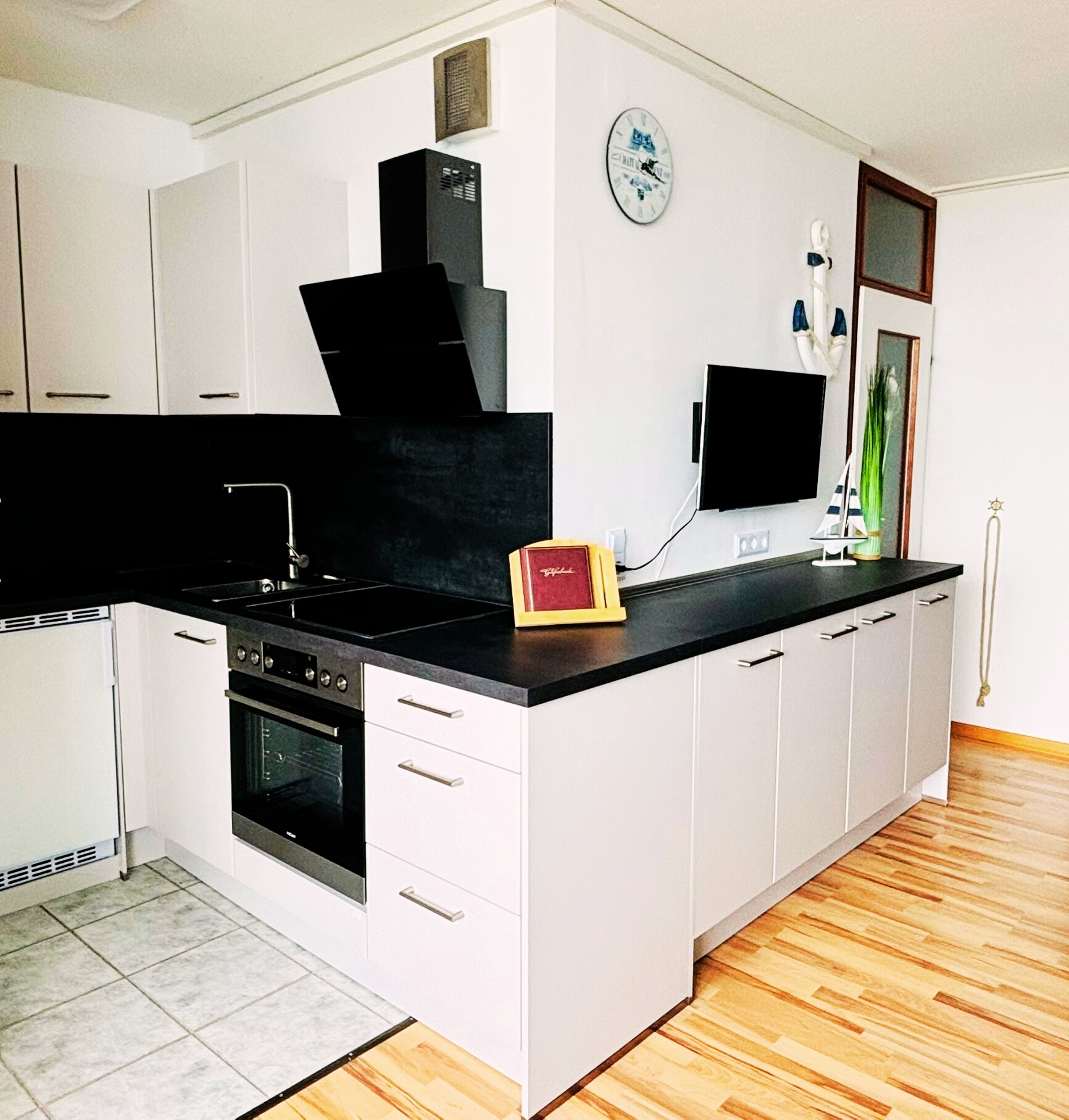 The apartment, spanning approximately 51 square meters, offers a bedroom with a double bed, a separate children's room with a bunk bed, play area, and desk, as well as an open-plan kitchen/living room with a dining table. Amenities include a flat-screen TV, radio, and a well-equipped kitchen with a ceramic hob, oven, refrigerator, coffee maker, kettle, hand mixer, toaster – and even a waffle iron for cozy afternoons on the balcony. The kitchen also provides all the essentials for a smooth start: spices, coffee, tea, sugar, salt, dish soap, and coffee filters – feel free to use what you need and replenish anything you're missing.